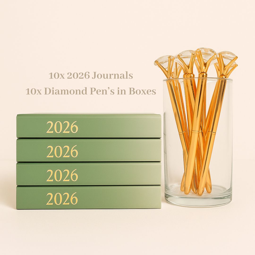 It includes 10 x 2026 journals and 10 x diamond pens. All journals come packaged in our signature velvet envelope sleeves. Pens comes packaged in a pink custom box.